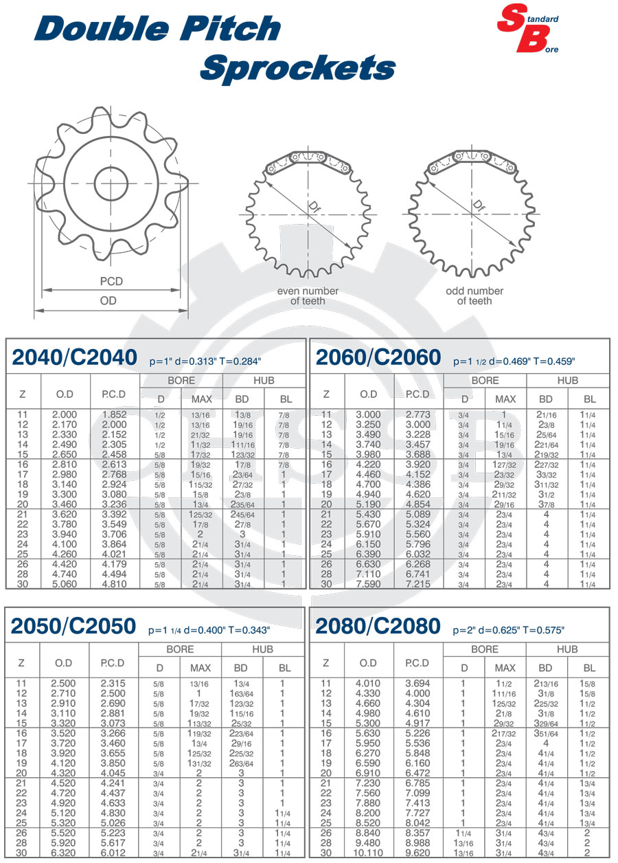 Range of product: ANSI:(2040/C2040/2050/C2050/2060/C2060/2080/C2080/ 2042/C2042/2052/C2052/2062/C2062/2082/C2082) Inch size product (Apply to ANSI market) Stock Bore Double Pitch Sprockets